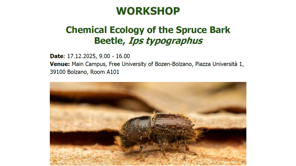 Il 17 dicembre 2025 si è svolto presso la Libera Università di Bolzano (UNIBZ) il workshop internazionale “Chemical Ecology of the Spruce Bark Beetle, Ips typographus”, co-organizzato da Eco Research e UNIBZ. L’evento ha permesso un proficuo scambio tra ricerca, gestione forestale ed applicata con l’obiettivo di approfondire le più recenti conoscenze scientifiche sul comportamento del bostrico tipografo e sulle strategie di gestione sostenibile delle infestazioni.